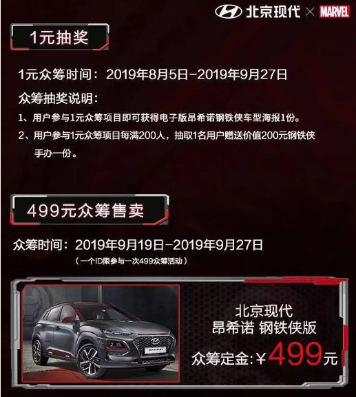 作為專為年輕人打造的個性座駕,北京現代以貼合年輕人喜好的形式,通過與阿里巴巴進行深度跨界品牌合作,在阿里魚眾籌平臺-“造點新貨”限量上線首批499臺昂希諾 鋼鐵俠版,以499元的預定金,發(fā)起為期9天、限量499臺的眾籌活動,為年輕消費者提供了全新的購車體驗。此外,針對購買昂希諾 鋼鐵俠版的用戶,北京現代還將提供分期3年免息金融政策,為更多年輕用戶降低購買門檻。